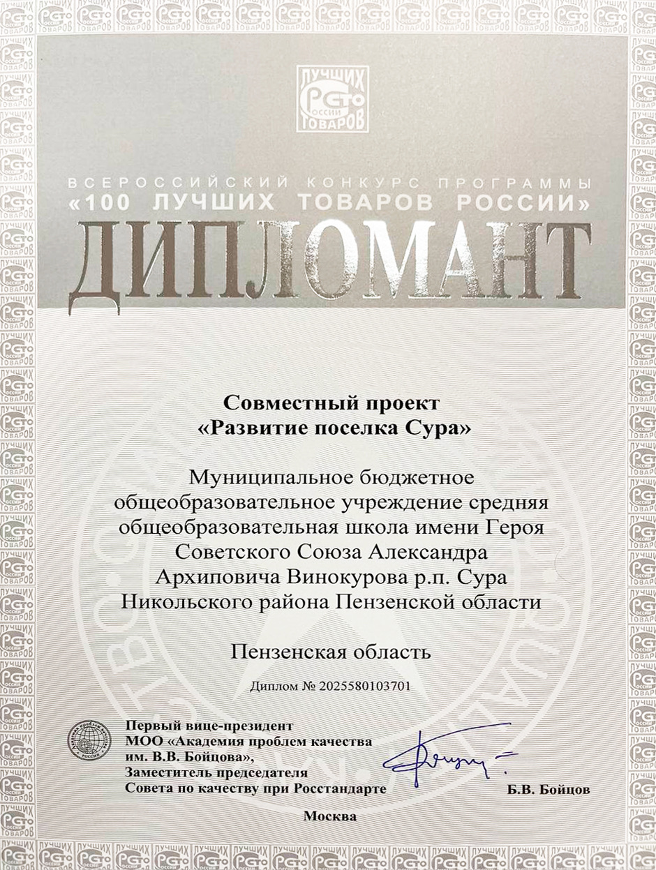 Министр экономического развития и промышленности Пензенской области Роман Трялин вручил диплом участника Всероссийского конкурса Программы «100 Лучших товаров России» и Почётный знак «Отличник качества» директору Сурской школы Людмиле Казариновой. Школе дано право использовать логотип Программы «100 Лучших товаров России» в течение 2 лет.
