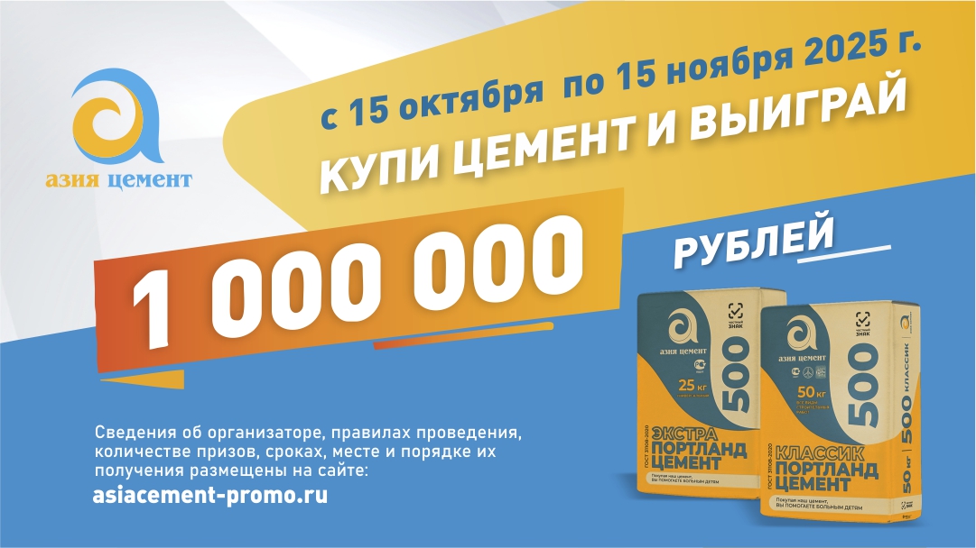 С 15 октября по 15 ноября 2025 года ООО «Азия Цемент» проводит акцию «Всё по-честному с «Азия Цемент» с розыгрышем 1 000 000 рублей. Акция проводится в магазинах,...